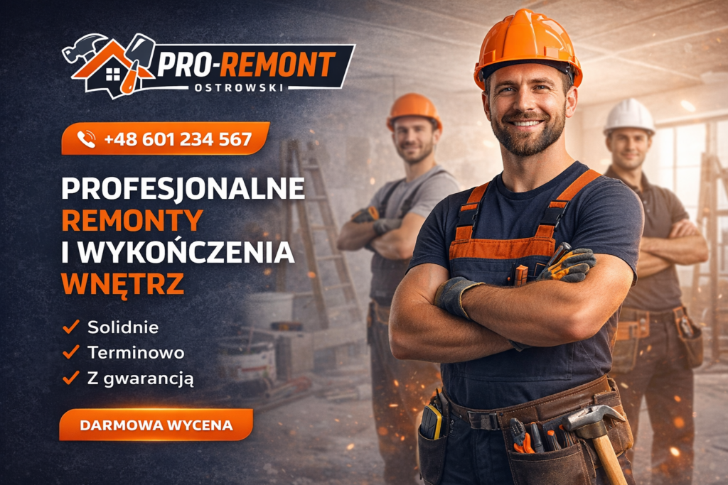 Jesteśmy lokalną firmą remontowo-budowlaną z Ostrowa Wielkopolskiego. Od lat pomagamy klientom w realizacji remontów mieszkań, domów i lokali usługowych. Stawiamy na jakość wykonania, terminowość oraz przejrzyste warunki współpracy.